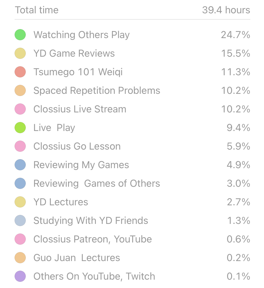 Now for the important stuff:My rated win loss ratio is 0:215:17 Essential Go Activities3:43 24% Live Play8:29 56% Go Problems3:05 20% Game Review